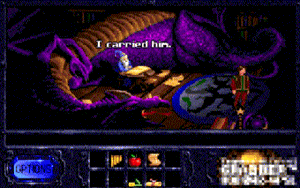 sind vermutlich die verbreitetsten Fantasy-Spiele überhaupt.14 Fantasy-Computerspiele sind wieder in verschiedene Genres wie etwa Jump And Run, Action, Adventures usw. zu unterteilen. Dabei sind sehr unterschiedliche Schwerpunkte und Problematiken vorhanden. Actionspiele sind beispielsweise stark gewaltorientiert, Adventures orientieren sich stark am Fantasy-Rollenspiel.15 Eine besonders aktuelle Form sind Live- Rollenspiele im Internet, etwa sogenannte Multi-User-Dungeons (MUDs), bei denen mehrere Spieler simultan am gleichen Spiel teilnehmen. Auf Fantasy-Computerspiele kann ich hier nicht weiter eingehen, diese Kategorie von Spielen wäre sicher eine eigene Untersuchung wert. Zur Illustration dieser Art von Spielen ein Bild aus dem Fantasy-Computeradventure The Legend of Kyrandia.