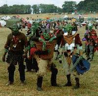 sind eine im deutschen Sprachraum noch relativ wenig verbreitete spezielle Form des Rollenspiels. Bei dieser Art von Spiel schlüpfen die SpielerInnen auch körperlich in die von ihnen dargestellten Charaktere. Dazu gehört eine entsprechende karnevalsartig anmutende Verkleidung, sog. Polsterwaffen, eine entsprechende Umgebung (etwa Waldlandschaft, Burg o.ä.). Sonst funktionieren sie ähnlich wie konventionelles Rollenspiel. Live-Rollenspiele sind, etwa wegen Unfällen, die nicht zuletzt aus der Identifikation mit der Rolle resultierten, in letzter Zeit öfter Gegenstand von Pressemeldungen gewesen.18 Das Bild zeigt eine als Orks o.ä. kostümierte Gruppe von englischen Live-RollenspielerInnen bei einem Treffen 1995.19
