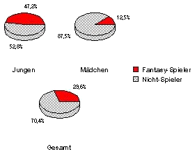 die Fantasy-Spiele kennen, nämlich 29,6% der Befragten, gaben an, Fantasy-Spiele auch zu spielen. Dabei ist der Anteil der männlichen Jugendlichen signifikant höher als der der weiblichen. Nahezu die Hälfte aller männlichen Befragten (47,2%) spielt Fantasy-Spiele, bei den weiblichen Befragten liegt die Quote bei nur 12,5%. Entsprechend sind über 80% der Fantasy-spielenden Jugendlichen männlichen, nur knapp 20% sind weiblichen Geschlechts. Dagegen macht der Anteil der weiblichen Jugendlichen bei den Nichtspielern ca 70%, jener der männlichen nur ca. 30% aus. Ein etwa ähnliches Bild bietet sich bei den Fantasy-Rollenspielern sowie bei der Zusammensetzung der Rollenspielgruppen. Diese Zahlen sind vorsichtig zu bewerten, da die Datenbasis bei den Rollenspielern mit nur 17 Befragten sehr schmal ist.26